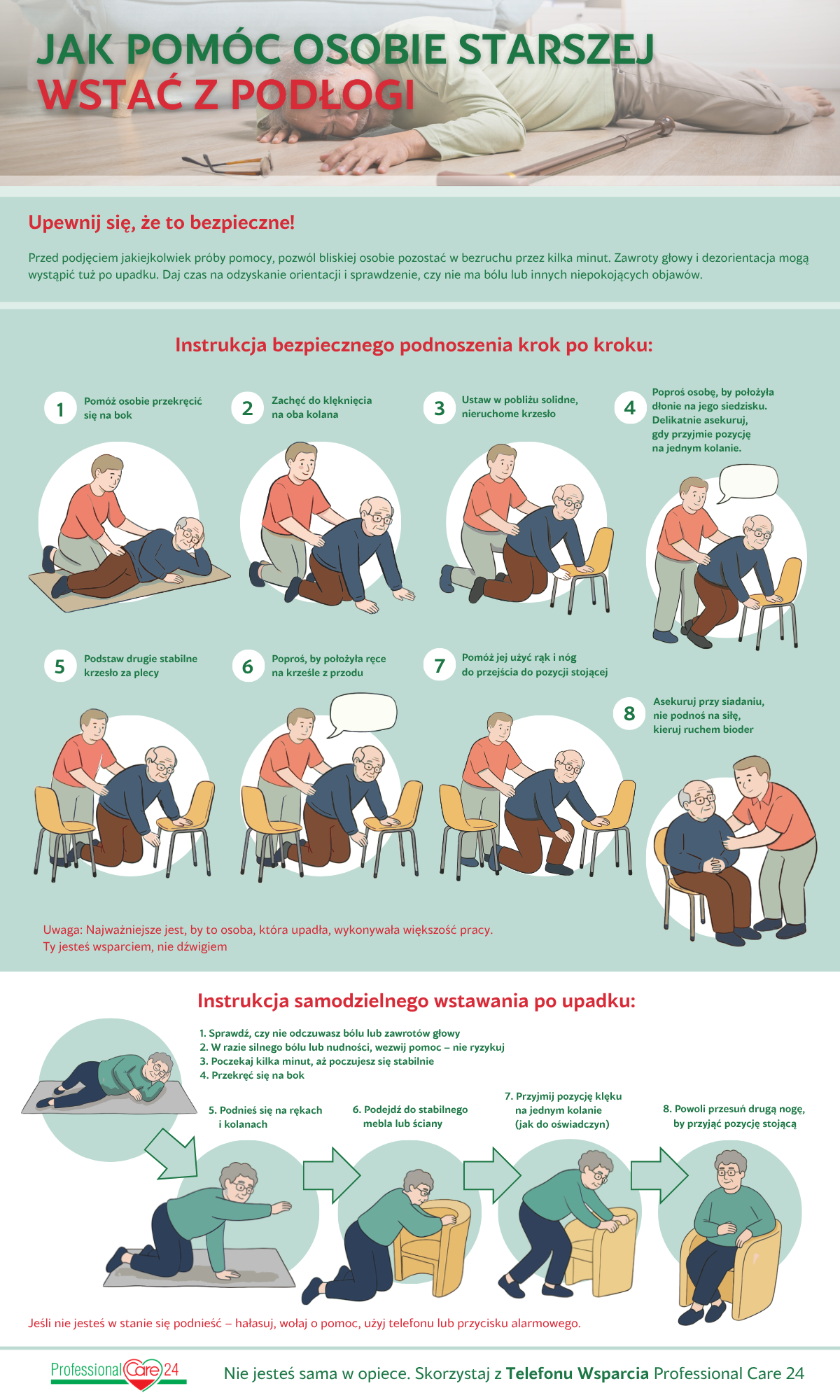 Upadek podopiecznego to częsty scenariusz w pracy opiekunek. Jak zastosować bezpieczne techniki podnoszenia?